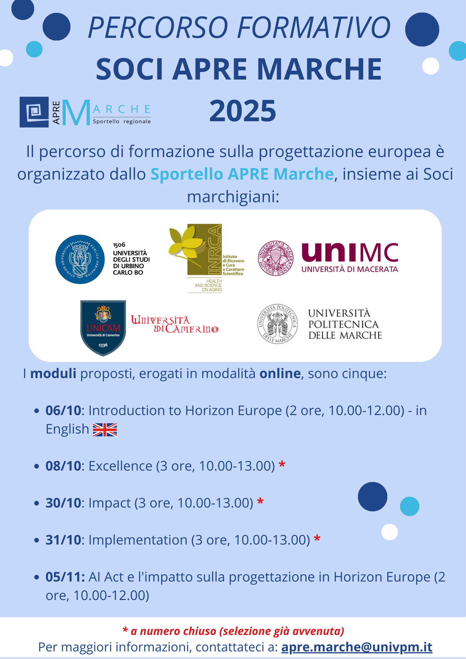 Il 31 ottobre dalle ore 10:00 alle ore 13:00 (online), si tiene il secondo appuntamento del Percorso Formativo Soci APRE Marche 2025, dedicato a presentare il concetto di "Implementation", una delle tre parti fondamentali delle proposte progettuali nell'ambito del programma Horizon Europe.